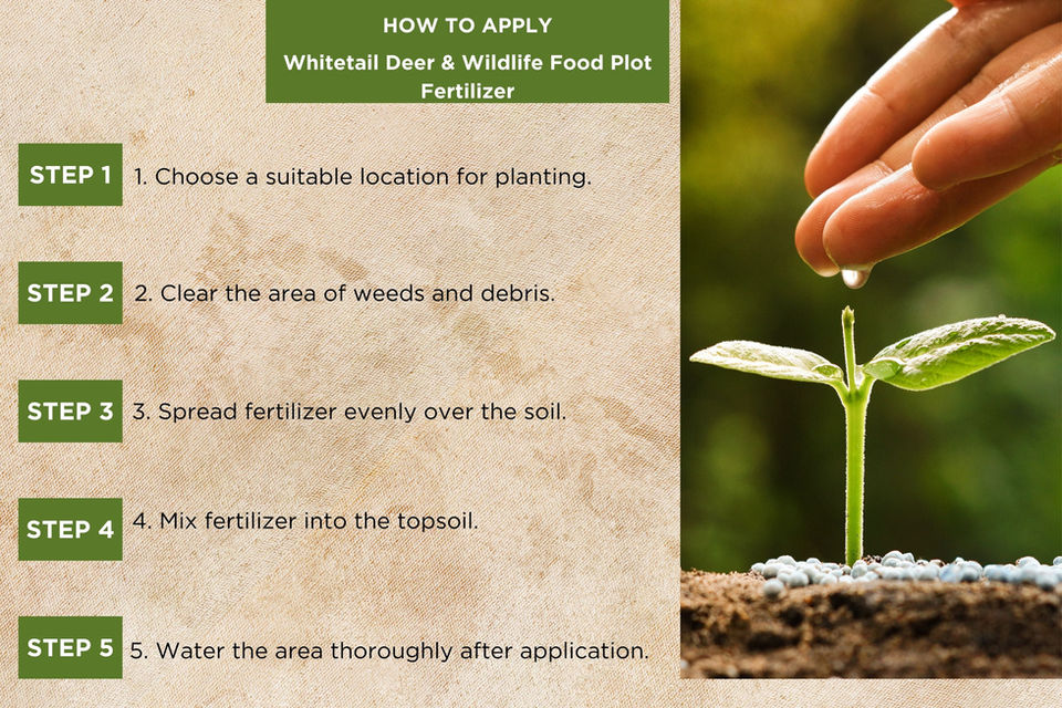 For Food Plots: Apply 200–300 pounds per acre, evenly broadcasting over the entire area. Incorporate into the soil using a tiller or harrow for best results.